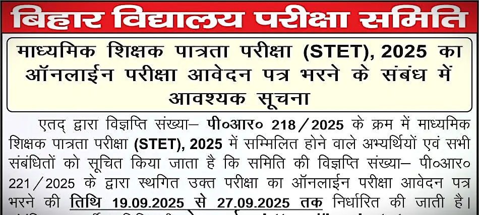 Bihar School Examination Board (BSEB) has released the notification for the Bihar STET Exam 2025. Candidates who meet the required qualifications and are interested in applying for the Bihar STET 2025 can submit their applications online from 19 Sept 2025 to 27 Sept 2025. For details about eligibility, Exam pattern, and more, please refer to the full notification below.